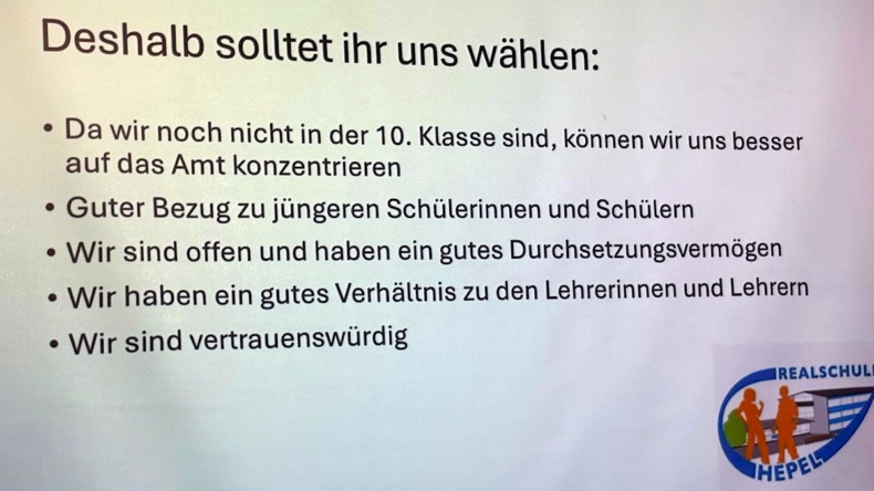 In einer Vollversammlung stellten die Kandidatinnen und Kandidaten ihr Wahlprogramm vor. Drei Teams bewarben sich um den Posten als Schülersprecherteam der RS Hepel: