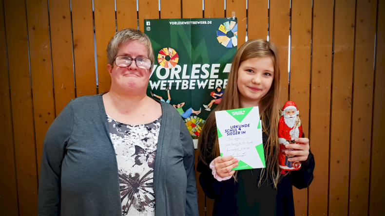 Besonders überzeugen konnte Pia Alker (6b), die einen spannenden Auszug aus dem Jugendroman „Crater Lake“ von Jennifer Killick vorlas. Mit sicherem Lesetempo, klarer Betonung und viel Ausdruck zog sie das Publikum sofort in die unheimliche Atmosphäre der Geschichte hinein. Als unsere Schulsiegerin des Vorlesewettbewerbs 2025 wird sie unsere Schule beim nächsten Wettbewerbsentscheid auf Kreisebene Anfang Februar vertreten.